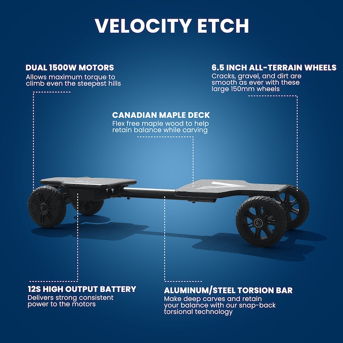 The Velocity Etch is a unique and versatile electric longboard that is perfect for commuting, exploring, and having fun. It is sure to turn heads wherever you go.