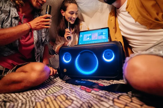 The Ikarao Break X1 is a 4-in-1 party speaker with a tablet. It is a portable, all-in-one device that can be used to play music, sing karaoke, and watch videos.