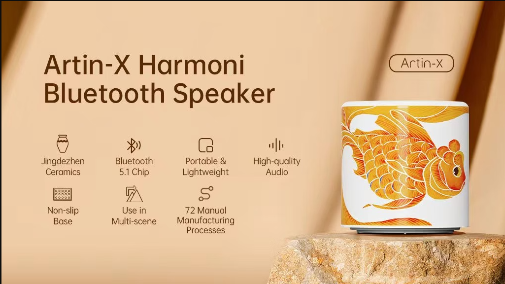 The Artin-X Harmoni Bluetooth Speaker is made of high-quality materials, including a ceramic enclosure and a metal grille. It is also very portable, weighing only 126 grams and measuring just 70 x 52 x 52 millimeters. The speaker has a battery life of up to 8 hours on a single charge.