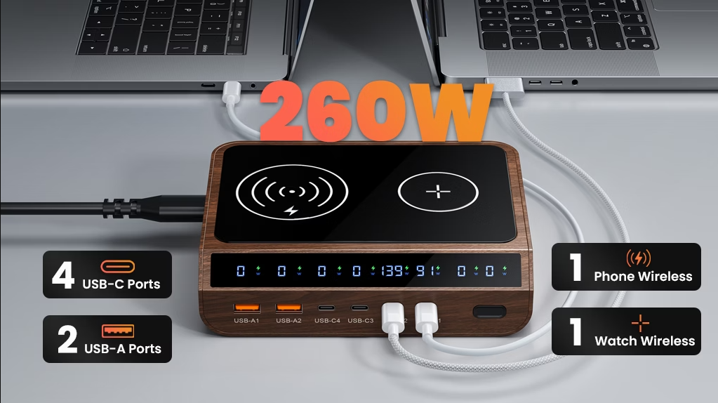 The Chagdin 8-in-1 260W Charge Station is a powerful and versatile charging station that can charge up to 8 devices simultaneously. It features a variety of ports, including USB-C, USB-A, and wireless charging, making it compatible with a wide range of devices.