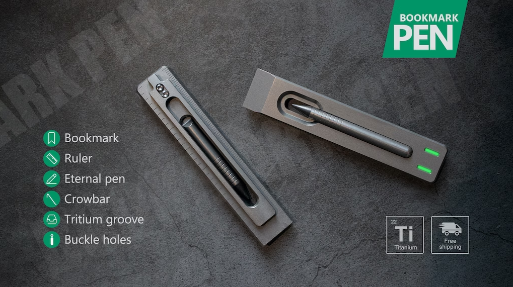 The BookBond Pen is a multifunctional pen that doubles as a bookmark and a multitool. It is crafted from titanium alloy, making it lightweight, durable, and stylish. The pen features an eternal ink cartridge that never needs refilling, and it has a dual-scale ruler for precise measurements. Additionally, the BookBond Pen includes a variety of multitool functions, such as a pry bar, a screwdriver, and a bottle opener.