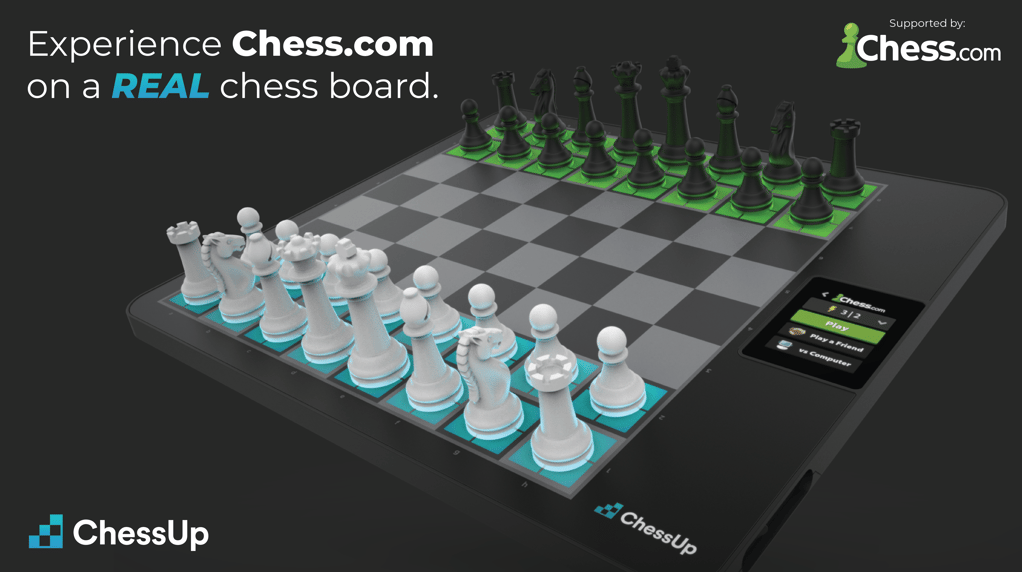 - Play Chess.com Games on a Real Board: ChessUp 2 is fully supported by Chess.com, allowing you to play your online rated games against humans or bots directly on a physical board. It’s the best of both worlds! No app is needed, and you don’t even require a smartphone. The wifi-enabled touch-screen board syncs directly to your Chess.com account, providing an authentic over-the-board experience. Once your game is complete, you can save and analyze it as usual on Chess.com.