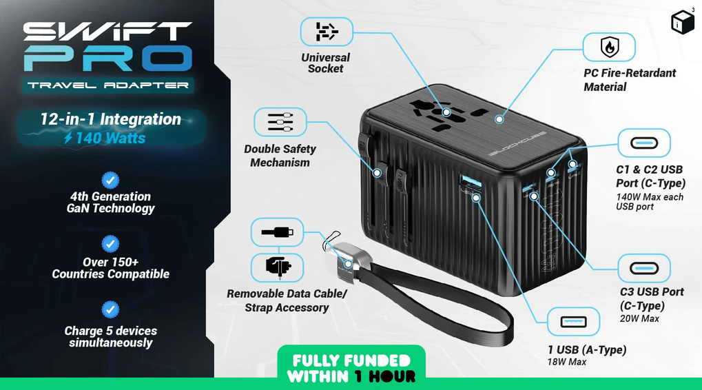 - The Swift Pro is a 12-in-1 travel adapter that combines cutting-edge technology with global compatibility.