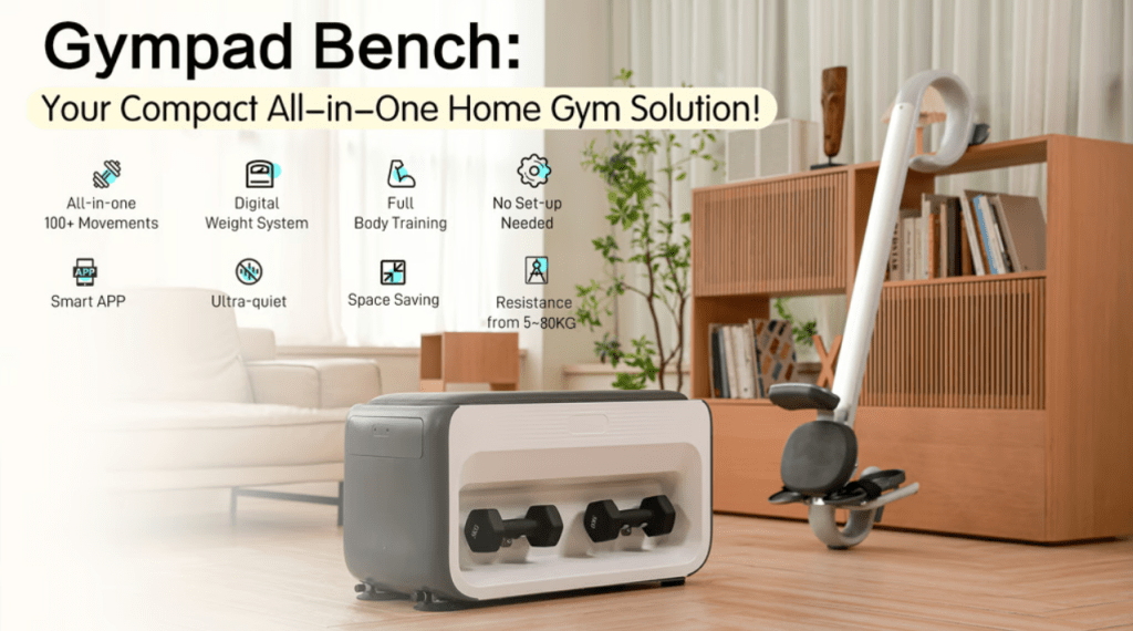 The Gympad Bench is an innovative and compact all-in-one home gym solution, perfect for those who want a versatile workout setup without taking up much space. Here are some of its key features:
